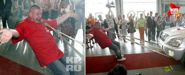 Ravil Kravchuk, becenevén Rav the Magnificent a tömeg előtt kihúzta fogaival három, négy tonnánál nagyobb össztömegű autót – és húzza őket 20 méterre! Nekem 4 tonna rekord, – osztja a sportoló. – Még mindig nem tudom megtenni! 2002-ben, alul Nagy-Britannia II. Erzsébet királynő születése emeletes busz, amelyben száz utas volt közösen súlya körülbelül 7 tonna. Ezt az eredményt a Bizottság rögzítette. Guinness Rekordok Könyve. Mellesleg én voltam az egyetlen ott egy orosz, aki fellépett Ennek eredményeként Ravil 20 évet szentelt az extrém sportoknak. első a sportoló fogaival megemelte a súlyát, majd 10 és 50 font palacsintát, és végül az állkapocs izmait olyan mértékben edztette, hogy képes legyen tartson 120 kg súlyt! Igaz, Ravil trükköi alatt fogak letörtek, tehát implantátumokat kellett beillesztenem.