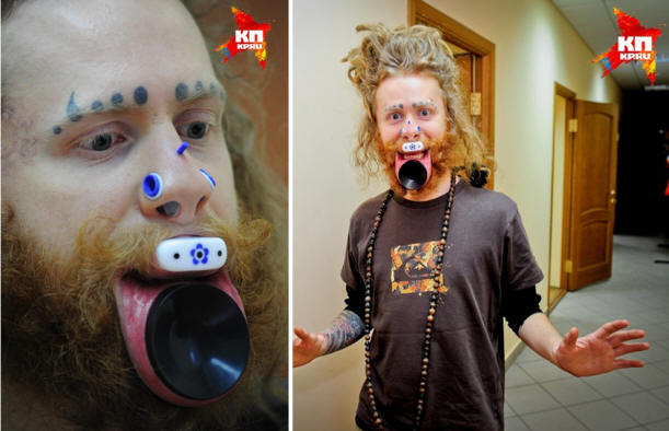 Jevgenyij Bolotov testmódosító, kísérletezik megjelenést. Lemeze van az ajkán, az alját 60 mm-rel nyújtja, teteje 33 mm-rel. És azt tervezi, hogy “végtelenségig” nyújtja őket. Nyújt és füllobogókat készít, alagutakkal készített az orrában, és most a között még a ceruza is nyugodtan áthaladhat az orrlyukakon. Meg is áttört orr porc, és most az orra meghajlik, mint a gyurma. Zsenya nagyon büszke arra, hogy ő az ilyen piercing egyetlen tulajdonosa a bolygón. – Nem, a gyerekek nem sírnak – neveti a 27 éves Perm tervező, – Az emberek néha egy ujjal mutatnak, mosolyogva a látásra kéri, hogy készítsek képet velük. Igaz, a srác panaszkodik: be a veszélyes Permi területeknek mindenképpen arcuk van bezárni. Még nem tisztázott, hogy az igazi fiúk hogyan fognak találkozni, üdvözölni sötét utca: az Urálban nem mindenki érti és fogadja el ezt “Beauty”.