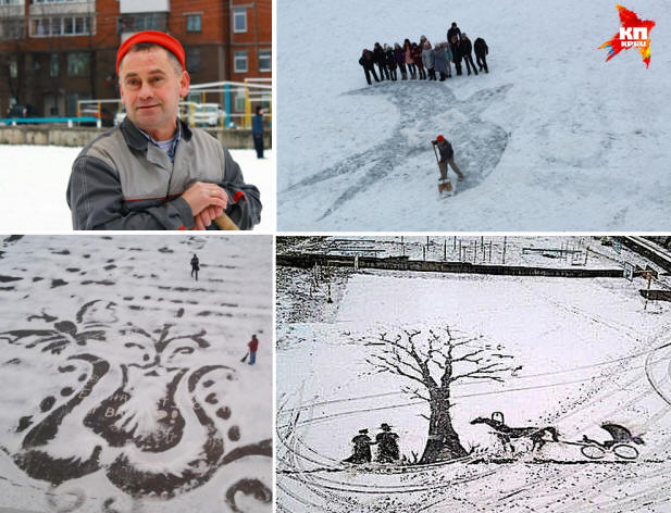 52 éve Semyon Bukharin tűzoltóként és bányászként dolgozott. Három évvel ezelőtt vonult vissza. Az iskolában gondnokként dolgoztam. majd és nem gondoltam, hogy itt találja őt, képzési célú dekorátort a hivatásod. Kefe helyett – lapáttal. Vászon helyett – iskola az udvar. Az a gondolat, hogy a hóban készítsenek, spontán módon jött – gondolkodtak az iskolások. Hálás nézővé váltak. Semyon Bukharin nem hajlandó dicsőség. Azt mondja, hogy ez mind a gyerekeknek szól. Shkolota válaszként felhívja őt nagy művész.