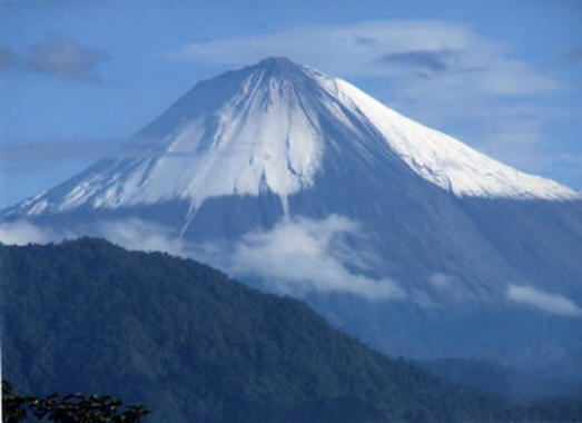 fénykép nyílt forráskódú Sangai vulkán, Ecuadorban található, túlnyomórészt stromboliai típusú kitöréseket dob ki, nagy clasztikus lavinakat képezve elérte az Amazonas alföldjét. Legkorábbi történelmi Sangay kitörése 1628-án kelt szinte folyamatos aktivitást regisztráltak 1728 és 1916 között év, majd 1934-től napjainkig. konstans A sangaya-i vulkáni tevékenység időszakos változásokat idéz elő kráterének alakja, amelynek vulkáni kúpja eléri a magasságot 5230 méter.