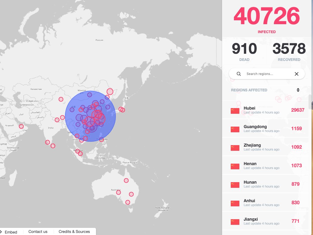 A kínai Baidu kereső egy járványtérképet készített a szokásos térképével együtt, amely valós időben mutatja a megerősített és feltételezett koronavírus-járványok helyét.