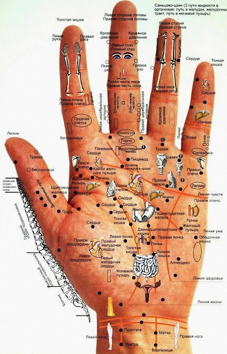 És ehhez elegendő az egyén kommunikációs sémájának megismerése a tenyér pontjai és zónái a belső szervekkel és másokkal testrendszerek. És ha például gyenge a szíved, akkor masszázs gyakrabban, nyomja le (lehetőleg illóolajokkal) megfelelő pontok középen (közelebb a bal szélhez – lásd séma a képen) tenyér. Ha fáj a lábad, masszírozza meg a falákat gyűrűs ujj, és így tovább.