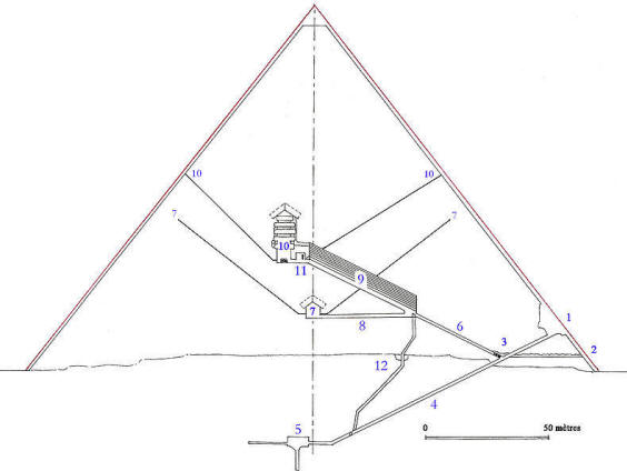 A második belső piramis tíz méter az oldalak kisebbek, mint a Cheops jelenlegi külső harmadik piramisa. Erről a kamerából kimenő két hosszúság (7) alapján úgynevezett (modern) szellőzőcsövek (20-25. szakasz cm.). Ezek a csatornák (a szakasz terv szerint), körülbelül tíz méter nem éri el a külső falak síkját. Bizonyos csatornák a név légcsatornák, természetesen nem igaz. nincs Az elhunyt szellőzőcsatornái nem voltak szükségesek. A csatornáknak volt egy másik rendeltetési hely. Ez az egyik “kulcs” a rejtély megoldásához a piramisok. A csatornák az ég felé mutatnak egy nagy pontossággal (bizonyos fokig) orientált útvonal ezekre csillagok, ahol az ókori egyiptomiak ötletei szerint a lélek letelepedni fog A fáraó halála után. A második piramis felépítésekor a csatornák innen: a temetkezési hely (7) elérte a külső falak szélét és volt nyitott az ég felé.
