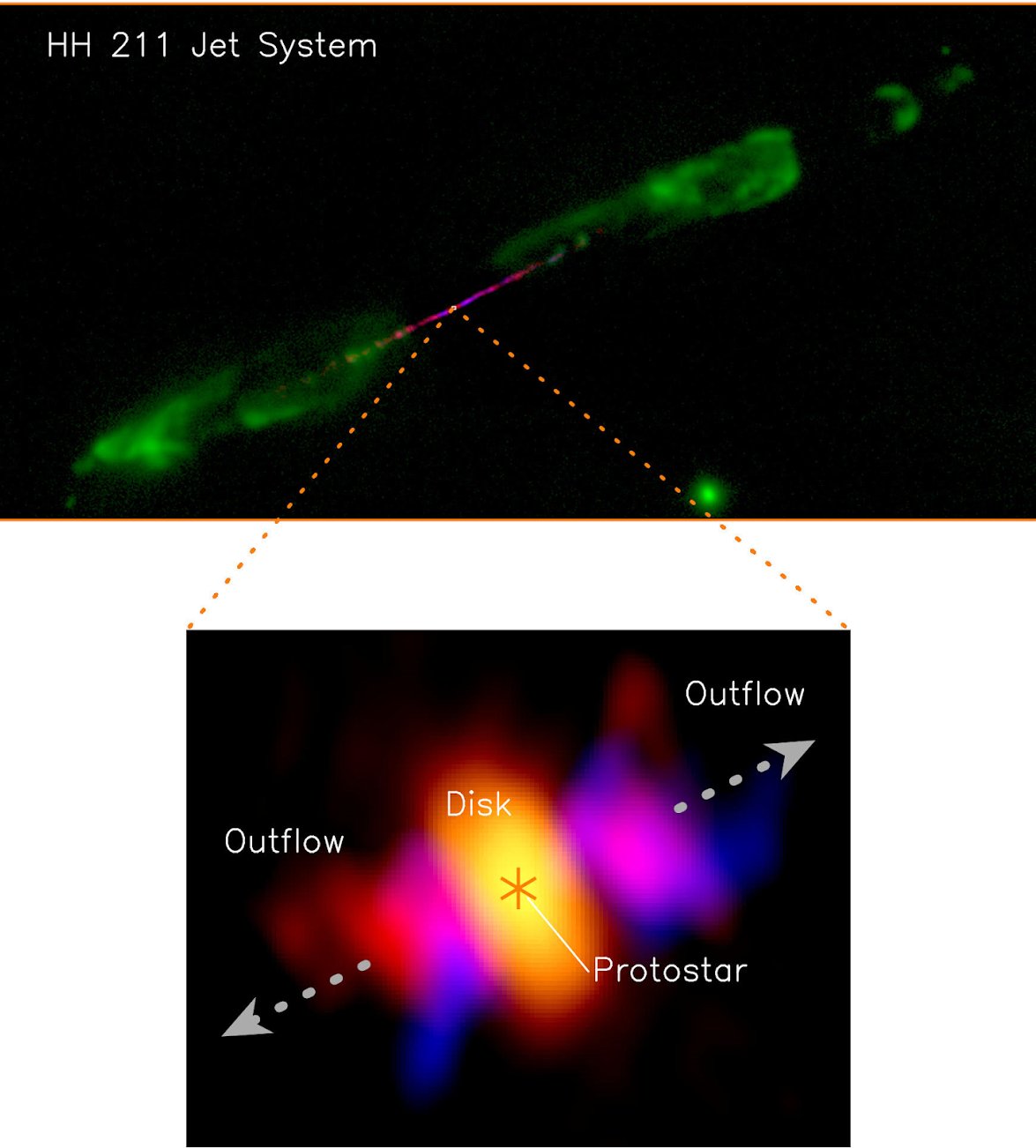 A HH 211 a Perseus csillagkép egyik legfiatalabb protosztelláris rendszere, körülbelül 770 fényévnyire a Földtől. A központi protosztárok körülbelül 10 000 évesek és kevesebb, mint 0,05 naptömegűek. Erőteljes bipoláris sugárzást irányít, ezért hatékonyan kell felszívnia az anyagot.