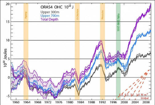 A hőtartalom becslése különböző mélységeken idővel (a mű szerzőinek képe). 2010-ben kutatók felfedezte az egyensúlyhiányt a hő globális eloszlásában. Ha mérik az energia, amelyet az utóbbi időben megragadtak az üvegház gázokból kiderül, hogy a légkör és az óceán felszíne nem melegszik fel amennyire kellene. És ez a hiány 2004 óta halmozódik fel évben. Egyesek szerint ez a hibahatáron belül esik, és mások azt javasolják, hogy a „hiányzó energiát” kell keresni a tengeri területeken a mélységek. Ezen túlmenően a légkör 1990-es években történő gyors felmelegedése, a az erős El Niño lassult a 2000-es években La Niña és sok más miatt úgy érezte, hogy véget ért a globális felmelegedés, és a tudósok ezt megtehetik hazamenni. A kutatás új fényt derít a problémára, előadó: Baldalece Magdalena és Kelland Erland Európai Középszintű Előrejelző Központ és szintén Kevin Trenbert, a Nemzeti Kutatási Központ légkör (USA). Összegyűjtötték és újraértékelték az eredményeket. vízhőmérséklet-mérések 1958 és 2009 között. Kiderült, hogy az óceánokban lévő hőmennyiség csökkenése egybeesik a következővel: erős légköri kitörések, amelyek a légkörbe kerülnek fényt blokkoló részecskék. Ezen felül 1998 után visszaesés történt az év, amelyet a hihetetlenül erős El Nino emlékezett vissza, ezért A világhőmérséklet új rekordot állított fel. Ha nem jár ciklusban a légkörben mindez könnyen magyarázható. El Nino állítja – a Csendes – óceán keleti felszíni hőmérsékletének emelkedése, és – ennek az energianak egy része továbbadódik a légkörbe, ezért felmelegszik. A párolgás az óceán lehűtését is jelenti. Ezen időszak végén az óceánban folytatódott a hőmennyiség gyorsan növekszik, különösen nagy mélységben. kutatók hangsúlyozza, hogy a 700 m alatti vizek felmelegedése nincs analóg. Az óceánok 1998 utáni felmelegedésének körülbelül 30% -a pontosan az éghajlaton esik ez a mélység. Miért pontosan felhalmozódik az óceánok ez a része? Különösen gyors a hőenergia? Úgy tűnik, hogy ennek oka változások a keringésben. Egy tanulmány ezt találta A La Ninyi és a Csendes-óceáni évtized átmenetileg idézhet elő a felszín felmelegedése, miközben a mélység megkezdődött energiát. És amikor a körülmények megváltoznak, akkor ez a hő melegíti az óceán felszínét. Kutatási eredmények megjelent a Geophysical Research Letters folyóiratban. Készítette: Ars Technica.