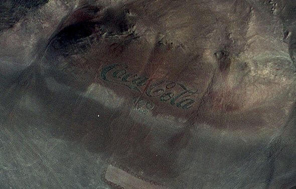 Ez a Coca-Cola logó régi palackokból készül. szóda és egy domboldalon található Chileben