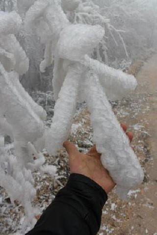 Tízezrek házak maradtak áram nélkül. Egész erdő a hegyekben Pilipet, Budapest délkeleti részén, köd-felhő borította, amikor esni kezdett. Ennek eredményeként minden fán kialakult jégtakaró.