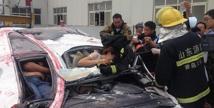 Qingdao városában, a kínai tartomány keleti részén Shandong, szörnyű közlekedési baleset történt. A tehergépkocsi-vezető nem szállít nehéz rakományt elvesztette az irányítást, az autó átfordult és több tonnás volt egy fémdoboz összeomlott egy elhaladó személygépkocsin a közelben.