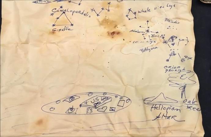 És végül a kincskeresők eltávolítottak egy nagyot egy darab papírt, amelyen a csillagtérképet manuálisan ábrázolták ég bolygókkal, csillagképeket és még egy csészealjat is. Ítélve mindazoknak a férfiaknak, akik ezt a kincset eltemetik, komoly érdeklődés volt az ufológia iránt. A térképen található kézzel írott szöveg leírja egy ember mozgásának kronológiáját azonosítatlan repülő tárgy.