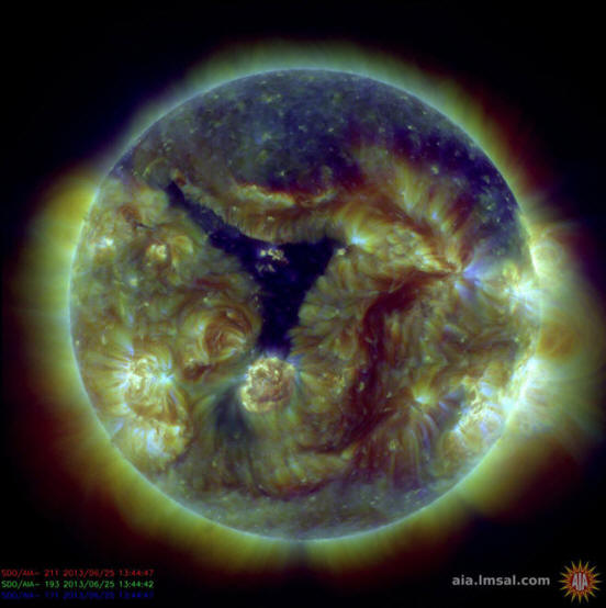 Fotó nyílt forrásból Kép a Napról, 13:44 GMT, 2013. június 25. © SDO | A NASA a Coronal óta a lyukak olyan területek, ahol a mágneses mező nyitva van, és a napszél nyugodtan áramolhat a világűrbe, akkor a mágneses viharok megkezdődhetnek a Földön. A geofizikusok számításai szerint NASA, erre június 29-30-án kerül sor. A hatás korábban megérinti teljes pólus, ahol poláris fényre lehet számítani.