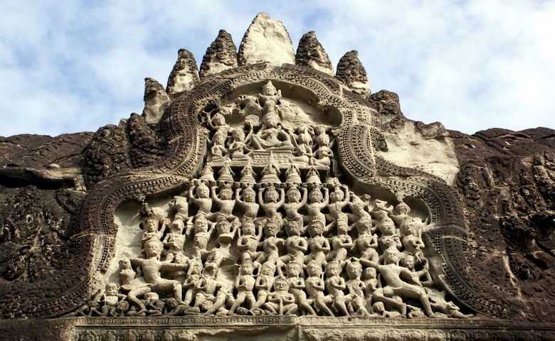 Sőt, a templomkomplexum összes felülete (és ez négyzetkilométer) borítják a legfinomabb domborműfaragással, mindenféle jelenetet ábrázol. Sőt, amint megállapítást nyert, ő megjelent falak, oszlopok, átjárók és így tovább építése után. Vagyis a kővágóknak nem volt joguk hibázni, mert egyébként szétszerelje például egy fal falát. Senki sem ért egyet ezzel jelenlegi építész! ..