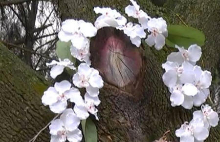 A zarándokok a Lviv régióban gyűlnek össze. Stryiben, in városi park a Szent Vlagyimir és Olga (ukrán) templom közelében Görög katolikus egyház) egy faház helyi lakosa Láttam a Szűz képét. Március 6. este a parkban fényes volt egy fáról érkező fény, és reggel meglátták rajta a Szűz arcát. A vörös foltot vágó ágot koszorú és törülköző díszítette. emberek imádkozni, sírni, megcsókolni egy fát, fényképezni.