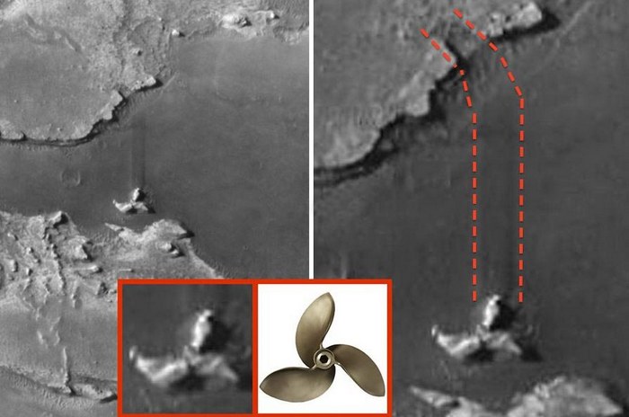 Legalább, mondja az ufológus, a Meridian-fennsík felszínén A propellerre emlékeztető szokatlan szerkezet jól látható. Minden szkeptikusnak, aki ezt közönséges kőnek tartja, meg kell tennie jelzi, hogy a talaj homokos, ezért rajta jól látható a nyom, amelyet ez az objektum hagyott leeséskor. Létrehozásra kerül azt a benyomást folytatja Scott, hogy egy UFO egy sziklába zuhant, és az okozta negyvenötöt fokosra fordult, majd döngölt a Mars felszíne, amíg meg nem állt.