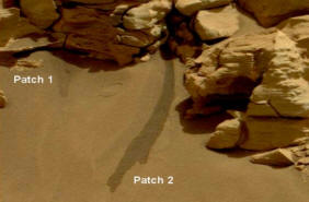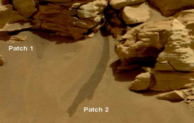 Amint az alábbiakban látható, két nedves folt jól látható a marsi homokban.