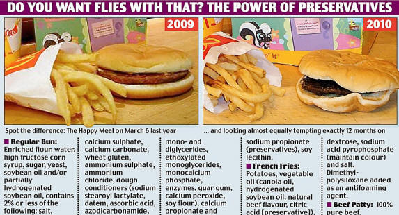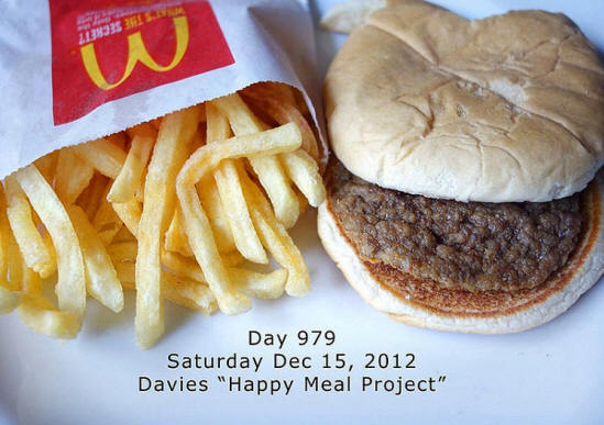 1996-ban az egészséges táplálkozási tanácsadó, Karen Harahan megkezdte a kísérletet: mennyi ideig képes romlás nélkül életben maradni hamburger az mcdonalds-ból. Kiderült, hogy legalább 12 éves. Ezen idő alatt a hamburger egyáltalán nem volt rossz. Az Egyesült Államokban sokan rohantak megismételni ez a kísérlet. Közöttük Sally Davis fotós. December 15-én A hamburger 979 napos lett – és még mindig jól van. tovább a fenti fénykép a harakhani kísérlet eredményét mutatja – csak balra vásárolt egy hamburgert a jobb oldalon lévő McDonalds-tól – amely 12 éves. mert ezúttal a termék nem rothadt, nem lett penészes, hanem csak kiszáradt a talp állapota olyan, mint egy zsemle, a marhahús állapotának. Harahan tetszik az egészséges táplálkozási szakember ragaszkodik ahhoz, hogy egy örök hamburger legyen mert válik konzerváló szerekkel és sóval. Mikor be 2008-ban ezek az eredmények megjelent, sok amerikai rohant végezzen ugyanazt a kísérletet. Közülük egy New York-i fotós Sally Davis. Még bonyolultabbá tette a tapasztalatot, ha hozzátette a hamburgert standard adag sült krumpli. Davis kísérlet eredménye minden héten képeket készít, és képeket tölt fel az oldalára a Flickrben. 2012. december 15-én a hamburgert és egy zacskót burgonyát 979 nap eltelt, és mindkét termék továbbra is tökéletes állapotban van! Nincs jele a rothadásnak vagy a penésznek, az egyetlen változás túl ezúttal – lényegében kiszáradtak, majdnem átalakultak kő:
