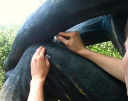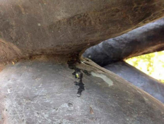 Az emlékmű következő könyvének látogatása során, a könyök tetején harcos, egy apró repedést észleltek, és mivel a szobor üreges, akkor belsejében, különösen a hűvös reggeli órákban, felhalmozódhat kis mennyiségű víz, amely csöpögött a térdre, állandó nedves folt létrehozása. A repedés technológiai jellegűnek bizonyult egy varrat, amely az öntés során mindig jelen van az öntőformák kereszteződésén szobrok. A varratok természetesen gitt és simaak, így nem szakadnak el a szobor teljes felületének integritását, de ebben az esetben a varrat volt látszólag rosszul foltozott, vagy a szobrász nem vett észre hibát.
