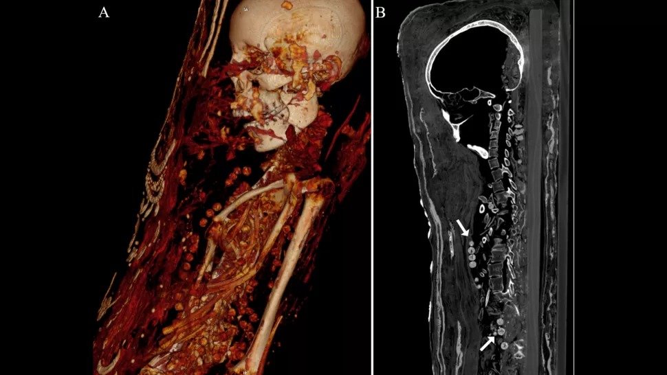A CT (számítógépes tomográfia) felvételek azt mutatják, hogy a három gipszbevonatú múmia egyikét szervekkel (akár aggyal) temették el, két nőt pedig gyönyörű nyakláncokkal temettek el – találták meg a kutatók.