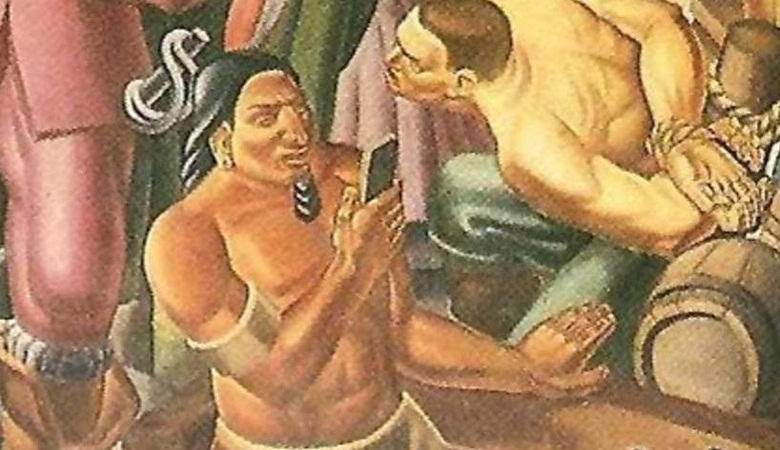 William Pinchon sikeres prémkereskedő és alapító volt Springfield város a Connecticut-folyó keleti partján. A kép Umberto Romano egy angol gyarmatosítót mutat körül honfitársaik és őslakos amerikaiak. Ebben azonban meglehetősen kaotikus jelenet van egy nagyon furcsa részlet, ami nem lehet ott. Az egyik indiai ül kenu, melyben egy fekete téglalap található, amelyet nehéz összekeverni bármi mást. Ez egy okostelefon! Ahogyan egy indián tettet helyezett be kéz, és hogyan néz rá, azt mondja, hogy ez valóban modern eszköz.