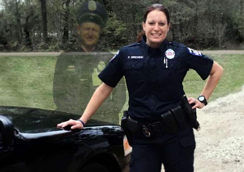 Másnap egy amerikai Pamela Mincio, aki rendőrként dolgozik a texasi Cleveland belvárosi részlege, közzétéve a A “Facebook” szociális hálózat nagyon szokatlan fotó. Ezen egy titokzatos rendőr áll és mosolyog mellette járőrkocsi, mellette egy áttetsző alak látható egy másik rendőr, férfiak.