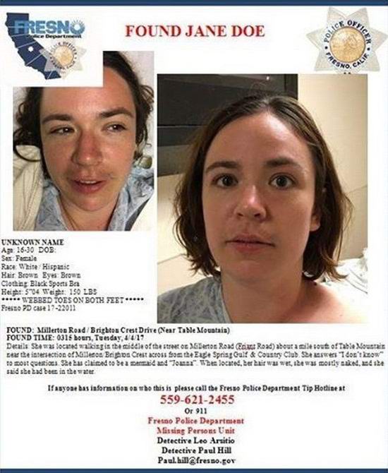Mark Hudson hadnagy, aki hónapok óta vizsgálja az ügyet, állítja, hogy ez az eset szolgálatában egyedi. Oh Jane Doe sokat beszélt a hírben (anélkül, hogy megemlítette volna, hogy ő “sellő”, és egyetlen néző sem azonosította a nőt Az ujjak szintén feleslegesnek bizonyultak a kriminalisztikában.