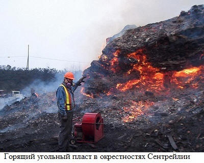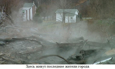 A Centralia lakosai nem terhelték magukat az ártalmatlanítás problémájával háztartási hulladék. A városi szemét egyik elhagyott gödör volt. Időről időre tűzoltók jöttek, törmeléket tüzet gyújtottak, és amikor kiégett, eloltotta a lángot és így tovább, a következő alkalommal. 1962 májusában a tűzoltók megcsalták, és nem oltották el teljesen a lángot. Parázsló tűz elterjedt egy szén-vénába, amely közvetlenül a város alatt halad át. A szénvarrás úgy villanott, mint egy gyufa. Kísérleteket tettek oltsa el a földalatti tüzet, de ők nem hoztak sikert. tűz tovább égett a 60-as és 70-es években. A kórházba egyre több olyan betegek érkeztek, akik orvosait meglepte szén-monoxid mérgezést talált. A 70-es évek végéig sikerült elkerülni a felesleges nyilvánosságot. És a föld alatti tűz minden folytatta a fellobbanást. Tűz!