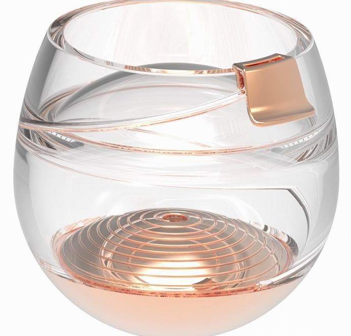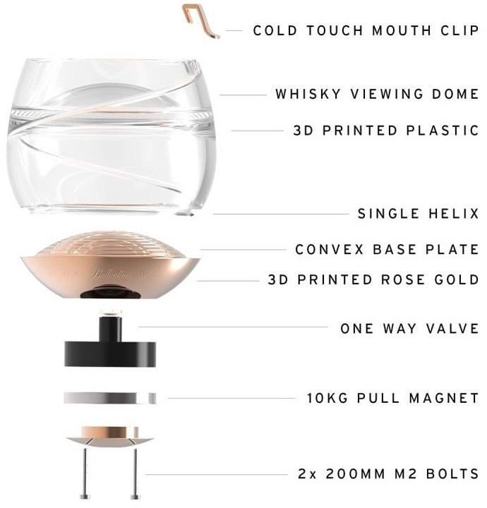 Az eredmény tartós műanyagból készült termék, amelynek alapja: rózsaszínű aranyban, amely más fémekkel ellentétben nem képes elrontani a whisky ízét. Ital lenyomta az üveget konvex talppal, majd felfelé emelkedik egy spirálcső segítségével, amely a széle mentén helyezkedik el kapacitását. A whisky eléri az ugyanabból készült szájdarabot rózsa arany és hűvös ital.