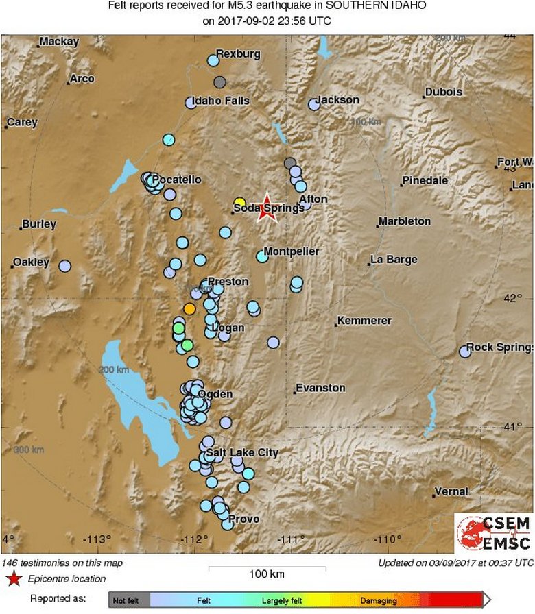 Az USA geológiai szolgálata (USGS) szerint Idahóban két súlyos szeizmikus sokk, amelyet 4,3 és 5,3 ponton rögzítettek a Richter-skála szerint, majd fehérebb fény utáni sokkkal világít erő valamivel kevesebb, mint 4 pont. A helyi lakosok arról számoltak be a földrengés nagyon észrevehető volt, bár nem okozott számotokra baj.