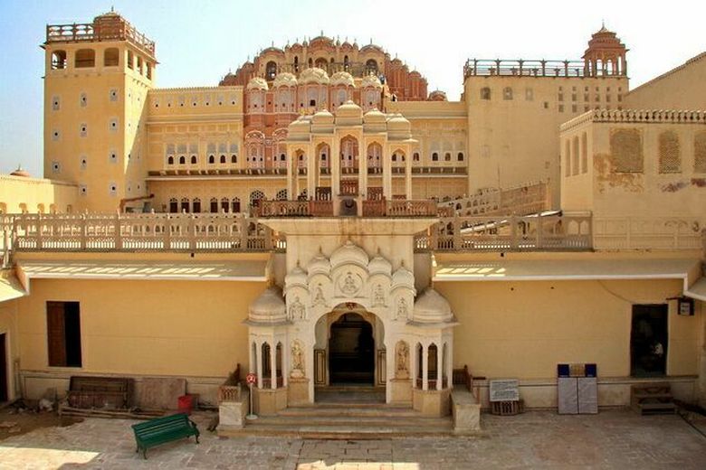 A Hawa Mahal látványos kilátást nyújt a híres városra A Jantar Mantar Obszervatórium, a Városi Palota, valamint a bazár Siredeori.