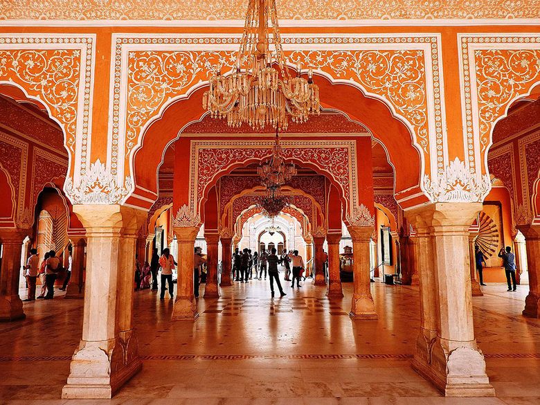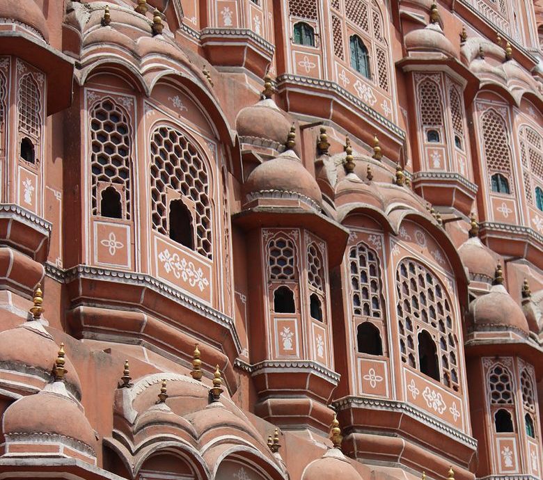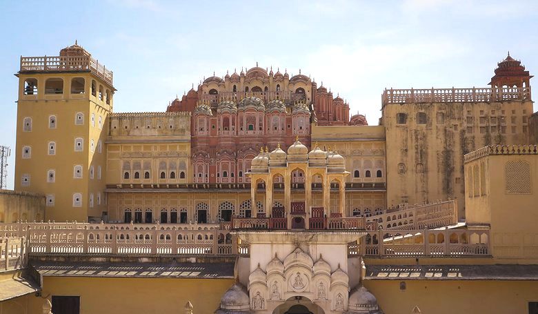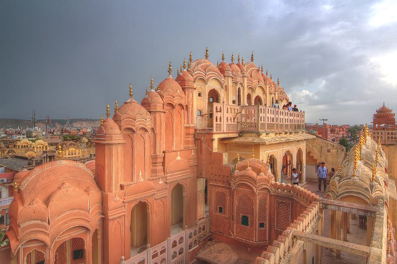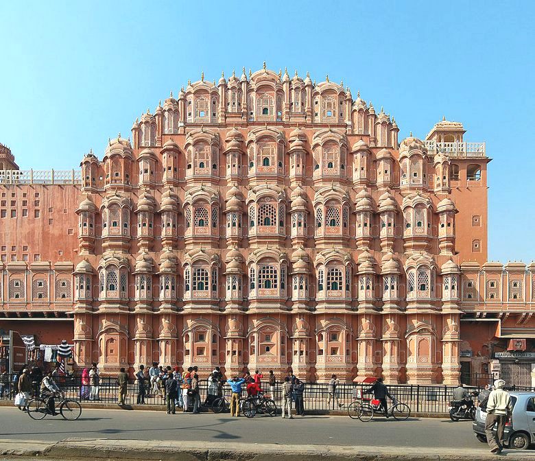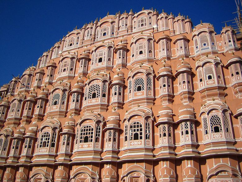 A Pink Sandstone palota Jaipur központjában található, lehetetlen összekeverni más épületekkel, tehát építészete sajátos. Az épület homlokzata, 2003 – ban készült Mór stílusú, úgy néz ki, mint egy óriás hangyaboly, vagy koporsó sok ékszerrel (ablakok, fülkék és fülkék) erkélyek). Kíváncsi, minden pompájáért, Hawa Mahal Nem úgy néz ki, hogy túlterhelt, inkább kifinomult.