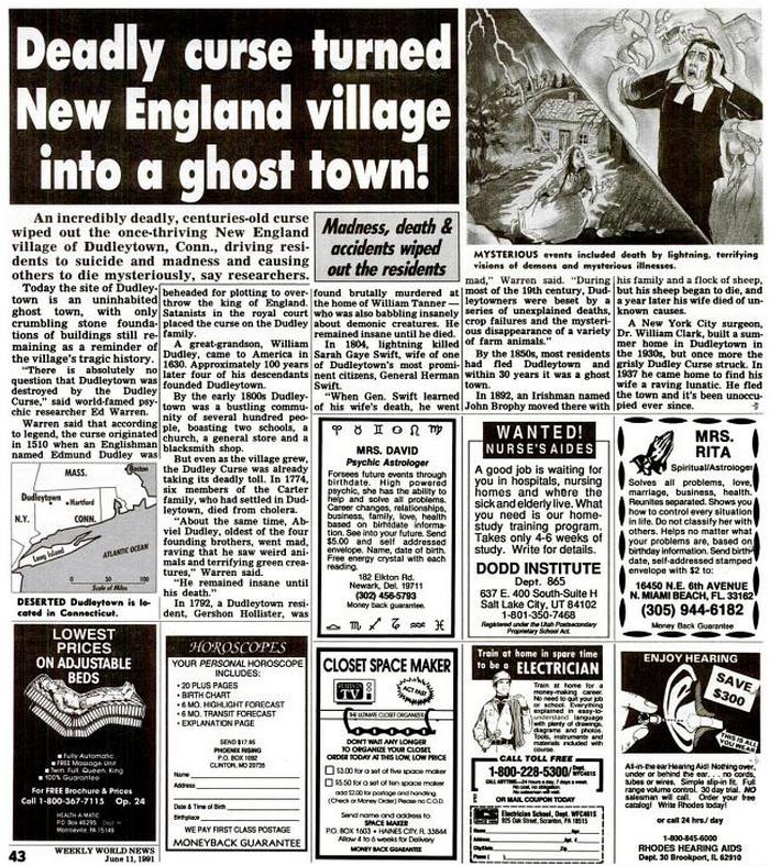Dan Ackroyd, a Hartford News újságírója a múlt századot töltötte alapos vizsgálatot és arra a következtetésre jutott, hogy Dudlitown és lakosait egyszerűen átkoztatták, ezért ezek a dolgok történtek itt misztikus halálesetek és események. Joseph Dudley alapította ezt a várost – az Edmund Dudley herceg egyik leszármazottja, aki a tizenhatodik században volt megpróbálta megdönteni VIII. Henrik királyt. A herceg fizetett érte a fejével, de a király azt gondolta, hogy ez nem volt elég, és ő a varázslók átkozta az egész Dudley-klánt.