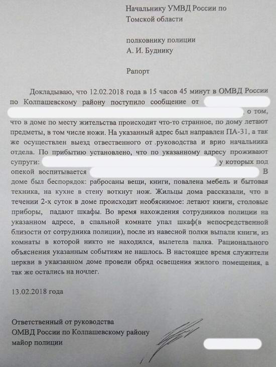 Aleksej atya, aki ilyen fontos templom előadására érkezett Treba azt mondta az újságíróknak, hogy saját szemével látta, hogyan az asztalról a főtt tojás levette és összeomlott Igor, a legfiatalabb fejen a család gyermekei. Hamarosan idejött Tomszk rendőri bizottsága. Vagy a magasabb rangú emberek nem hitték Artamonov őrnagynak, vagy éppen ellenkezőleg, úgy döntöttek, hogy azonnal átveszik az irányítást a helyzet felett, hogy senki sem maradjon poltergeist akciók miatt szenvedett. Igen sok alkalmazott egyenruhában Még ilyen magas rangsorban soha nem láttak őket Maraxban. család, háztulajdonnal rendelkezik, és már elég szenved a cselekedetektől láthatatlan szellem, jelenleg rokonokkal és amíg sietve visszatér magához.