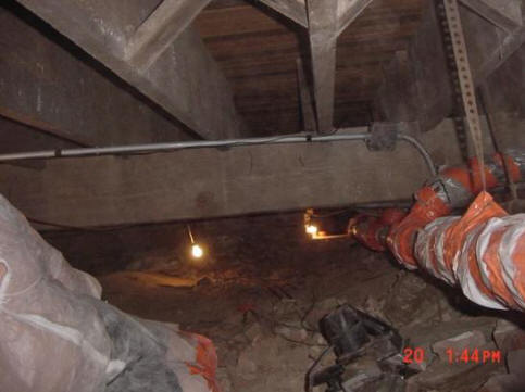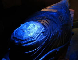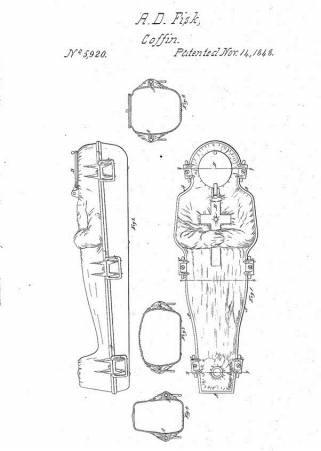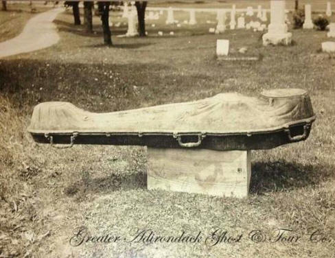 A túlsó sarokban egy nagy, fém koporsó szokatlan egy olyan forma, amely fele kinyúlik a földről.