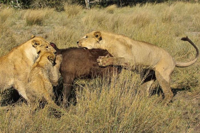 A ragadozóknak azonban óriási előnye van, hogy ők félelem nélküli vadászat egy állományban, amely ugyanakkor nagyon szervezett és fáradhatatlanul elérve az élet fő célját – eljutni hús ebédre. Ugyanakkor a legtöbb esetben az oroszlánok megpróbálják újból elfogni a leggyengébb állatok bivaly-állományából, és még jobb – fiatal növekedés.