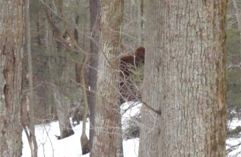 Az ember által készített kép havas erdőt mutat. egyenes a háttérben a két fa között magas látható majomszerű alak vöröses hajjal. A szkeptikusok ebben biztosak ez egy közönséges mohás csonk, de a tanú azt állítja, hogy a lény gyorsan sétált az erdőn, és hangosan morgott a hóval, mi az egy csonk?