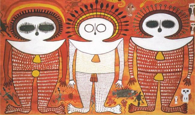 Először az összes darabot fehérre festették. Nyilvánvalóan így vannak Hangsúlyozni akarták a mennyei hősök szokatlan színét. Következő a ruházatra érdemes figyelni. Így érzik ezt a rajzolt figurák furcsa színezése. Ausztrál Bushmen alapvetően nincs ruhája – a forró egyenlítői, trópusi és A déli kontinens szubtrópusi klímájához egyszerűen nincs szükség. A hősök furcsa “bőre”, különböző a test különböző részein és belül színes és “számla”, kétségkívül lenyűgözte az ausztrálokat, hogy ők és tükröződnek rajzaikban. És természetesen nem szabad figyelmen kívül hagyni furcsa gömbök, amelyekbe a mennyei hősök fejeit helyezik. önmaga arra utal, hogy a művész megpróbálta ábrázolni visel arcmaszkot.