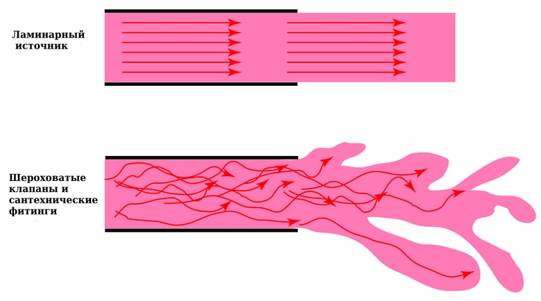 Lamináris áramlás esetén a folyadék rétegekben mozog, nem keverés és nem pulzálás, azaz nyomás hirtelen változása nélkül és a sebesség. Ahhoz, hogy az elsőtől kezdve oly fantasztikus legyen kilátás az áramlásra, nagyon tiszta vízre van szükség, a cső sima belső felület és természetesen a szél hiánya. Ha minden ha a feltételek teljesülnek, a vízsugaras fagyosnak tűnik, vagyis statikus, bár a valóságban egyenletesen mozog rétegekben.