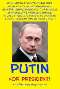 A felirat felirat a plakátra fentről lefelé: Ő őrzi a határait ország; védi állampolgárait külföldön; betiltotta az iskolákban meleg propaganda; pénzügyi bűnözőket üldöz; beültet azoknak börtönjei, akik az egyházakban káromkodnak; felveszi az ország érdekeit a saját felettük. Putyin az elnöknek!
