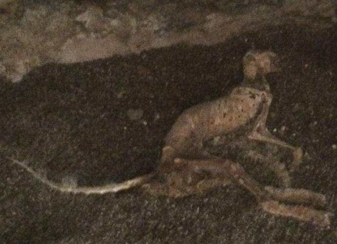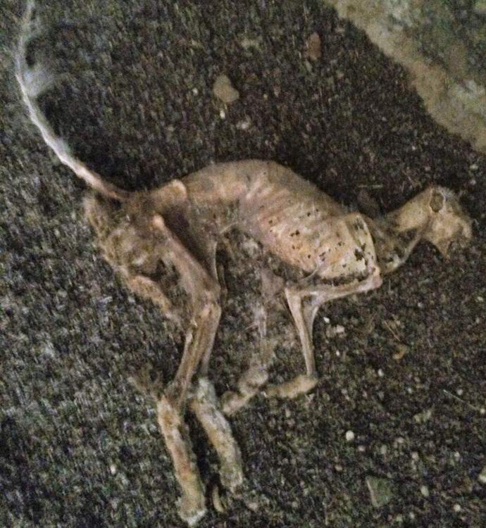 Amerikai szerint: “Úgy döntöttem, hogy kicsit visszaléptem a híres személytől engem sétál és fedez fel olyan helyeket, ahol még nem voltam. Kikapcsolás a a tervezett útról kb. egy kilométert sétáltam, és átmentem egy kis barlang mumifikált maradványaival egy bizonyos lény. Egy sarokban feküdt a távoli egyikben ágak. Hosszú hátsó lába volt és viszonylag jó rövid és hosszú farok. A fej kissé hasonló. macskán, de ez határozottan nem macska. Az állat viszonylag kicsi, de nagyon heves megjelenésű. Talán chupacabra kölyök, nem felnőtt. ”