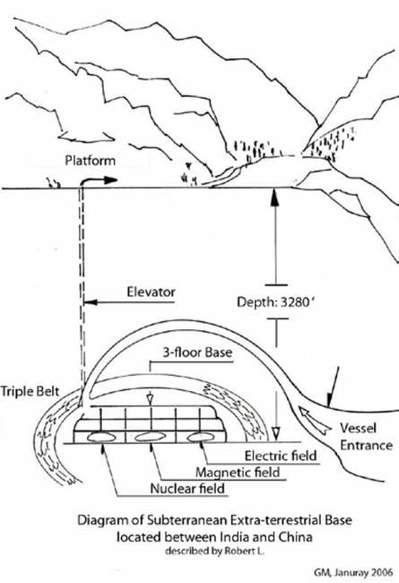 A barlangba tett kirándulásra vitték, ami valójában volt egy többszintes bázis, amely több mint 3000 láb mélységben épült. Az alapot háromszoros mágneses öv veszi körül, amely elkülönítette és megvédte őt a földrengésektől. Nagyon sok szoba volt a bázison. ajtók felvonók nyíltak a peronra, szabadban, ahol csak tudott este menni, bár ugyanakkor kísérte. Telek súlyos volt, magas havas hegyekkel. “Útmutató” bemutatása hogyan lehet szétesni egy fát gömbszerűen eszközöket, amelyeket mindig magával vitt. űrhajó repültek az alapba egy kanyargós bejáratú kanyargós alagút mentén, alacsonyabban található a völgyben. Az alagút hatalmas csúcspontú volt hangárok, ahol a hajók és a személyzet találhatók. Robert látta 90 méterről induló hajók. Engedték be helyiségek az alapon belül, néhány terület kivételével. Egyszer ő kénytelenek voltak bemenni a nukleáris anyagokat tartalmazó helyiségekbe, mágneses és elektromos mezők. Láthatatlan fal azonban kiszorult azt.