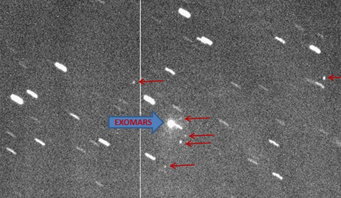 Az Európai Űrügynökség által a a saját weboldalukon, ahol ausztráliai fotók is jönnek, Brazíliában, Új-Zélandon, észreveszi, hogy az ExoMars állomás, ami egy meglehetősen nagy fényes tárgynak tűnik a képen, kísérje az űrben hat kisebb járművet szinkronban földi rakéttal mozog (az alábbi képen vannak jelölve piros nyilak).