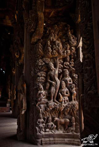 Fotók nyílt forrásból Összesen a templomban 170 szilárd oszlopok hatalmas fákból. Thaiföldön azt hiszik, hogy minden fában él egy szellem, és amikor egy fa meghal, egy szellem elhagyja őt. Az útmutató szerint itt, az Igazság templomában, van egy oszlop óriási fa, amelyet a szellem nem hagyott el. Thais ezt a szellemet hívja Ta Kien, és hozza meg felajánlásait. Az igazság templomának szépsége az útmutató elmondja, hogy az Igazság templomának minden szárnya tartalmaz képek a buddhista és a hindu vallásokkal és a Kambodzsa, Kína, India és Thaiföld mitológiái. Természetesen egy olyan ember, aki nem kezdett a keleti kultúrába és filozófiába nehéz kitalálni, többet lát, és elnyeli a szépséget. De itt van? A szobrok gyakran aránytalanok, összeszerelve vannak durva, állítólag antik, de rájuk nézve még csak nem is jön be fej rajzoljon analógiát Angkor Wat vagy más szobrokkal Khmer képek. Úgy tűnik, hogy csak egy szobor saláta és mintás szál. Érdekes módon a sabay-sabay ír ennek a látványosságnak a teljes része: “Teljesen fából és faanyagból készül vékonyra faragott, ez az épület tele van vallási és a filozófiai igazság és megmutatja, mit ért el az ember civilizáció “- írta egy leírás. Valóban így van. A templom egyes részei már harminc éve rothadtak szabadban, mások épülnek, mások helyreállnak. Templom kis példányként emberi civilizáció. Nem képviseli egyetlen vallást, az kísérlet a szomszédság nemzeti és vallási hagyományainak egyesítésére “Így pontosan és lakonikusan írta le a jelentés jelentését ezt a struktúrát, amelyet szemtanúknak mutatják be.