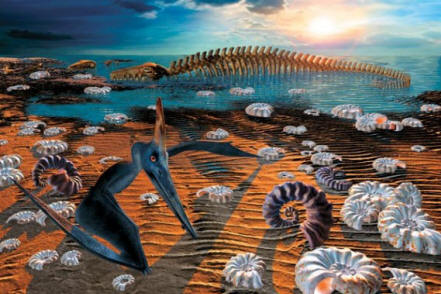 Az, ami a szárazföldön történt ezekben az évezredekben, csak az hiszem, mert a határ egyértelműen nyomon követhető a tengeriig rétegek, földbirtokokban Jól bebizonyosodott, hogy a tulajdonosok sushi – változatos és számos dinoszaurusz és pterozaurusz – ez A mérföldkő nem maradt fenn.