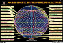 Három szimmetrikus szélesség metsződik három szimmetrikus meridiánok, 4 szimmetrikus téglalapot képeznek a csúcsokon keresztül amelyet átlós rajzolhat. De az a tény, hogy a felek mindig több téglalap lesz az Egyenlítőhöz közelebb a pólushoz közelebb lévő oldalak, azaz magasabb szélességi fokon. És azért meg kell húznia a jobb átlót a közepén szimmetria, a két magasabb téglalap kissé legyen lapított. Más szavakkal, a magasabb szélességnek kissé kell lennie közelebb az előzőhöz, hogy két szimmetrikus átló áthaladjon pontosan a szomszédos téglalapok csúcsán. Ezért az elv és a leginkább monumentális történelmi helyek találhatók, amelyek szélességi körei a meridiánokkal kölcsönhatásban többet alkotnak szimmetrikus hálózatok, amelyek az egész bolygót lefedik. Távolodunk az Egyenlítőtől bizonyos tárgyak szélességei között csökken a távolság (szög) figyelembe véve a Föld pólusokra való keskenyedését, pontosan annyira, hogy azokvá váljanak lehetséges a szimmetrikus szerkezetek kialakítása a labdán.