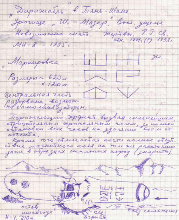 1991 szeptemberében a SAKKUFON Biškek fiókjában (Közép-ázsiai és Kazahsztán Ufológiai Tudományos Bizottság) információ jött arról, hogy a hegyekben Przhevalszktól keletre esik a hegyek határ Kínával a Shaitan-Mazar UFO traktusban összeomlott. sietősen az összeállított expedíció katasztrófa helyét keresték, de a heves korai havazások miatt nem lehetett bejutni a traktusba. keresztül 15 nap múlva a csoport visszatért.