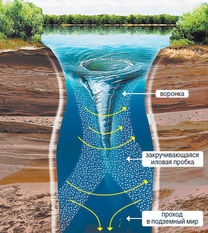 A szonárt használó tudósok azonosítottak fenéktelen, de fenekének tizenöt-harminc méter mélyén van (ez az érték folyamatosan változik) egyfajta sáros forgalmi dugó. Úgy döntött, hogy egy kötellel kötött nehéz súlyokkal lyukasztja, A kutatók csaknem fizettek az életért, mert hirtelen víz körbefutott a hajójuk körül, így dobták a kettlebellét és alig tudott menekülni, és az evezős forgót a partra húzta.