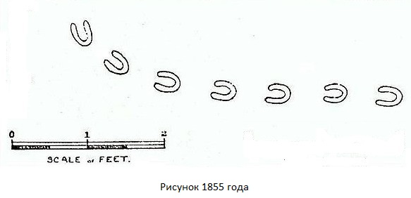 Az emberek összegyűltek. A nyomok simán meghosszabbodtak egymást követő láncok 20-40 cm távolságra pataszerű, 10×7,5 cm méretű nyomatok olyan, hogy az őket elhagyó lény nem volt négylábú, sőt még nem is két- és egylábú!