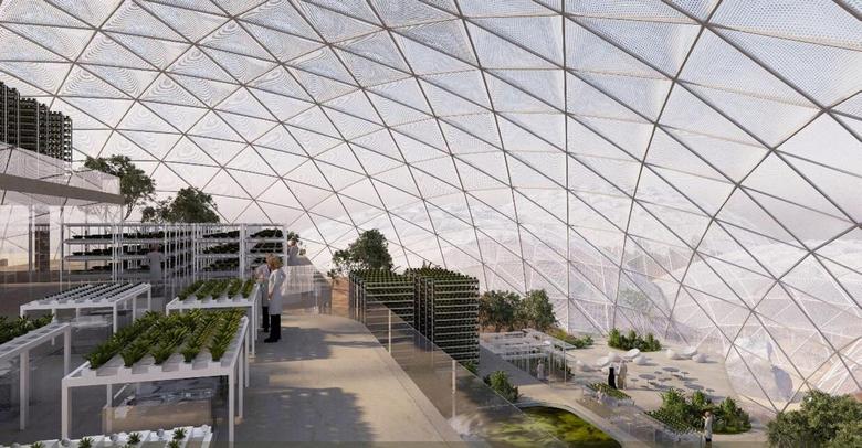 Felhívjuk figyelmét, hogy ezekben a kupolás szobákban különös üvegházak lesznek a zöldségek és zöldségek termesztésére Zöldek a gyarmatosítók számára, más zöldterületek azóta a településnek teljes mértékben biztosítania kell magát élelmiszerekkel és “élő energia”.
