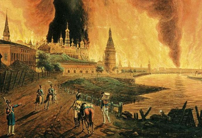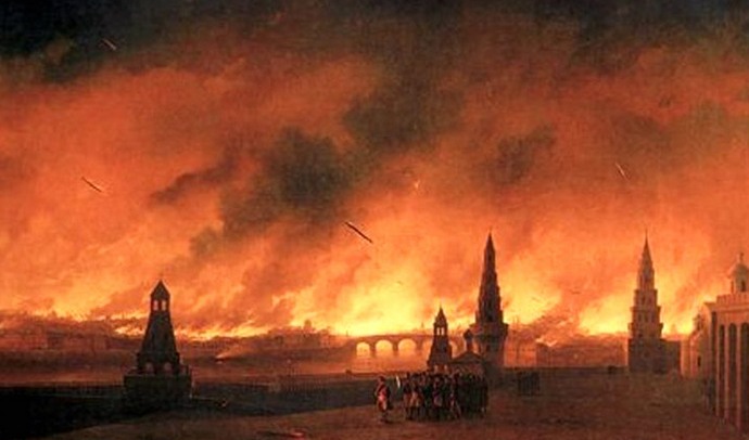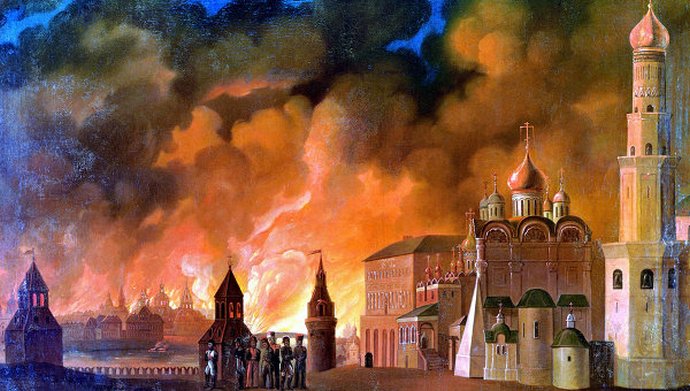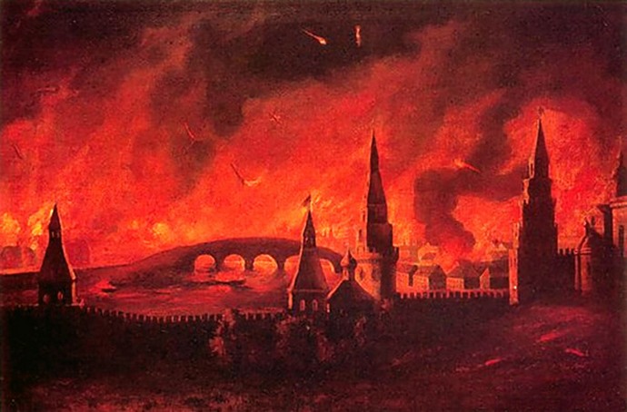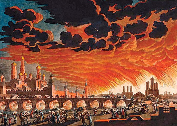 És míg Bonaparte várta, hogy a legyőzött oroszok elhozzák őt a Moszkva kulcsait, és üljön az tárgyalóasztalnál Oroszország fővárosában tűz tört ki, amelyből az egész város gyakorlatilag megégett. után ebből a francia hadsereg kénytelen volt elhagyni Moszkvát és … menekülni hatalmas veszteségeket szenvedett otthonát a Smolenszki úton sújtotta. Tehát a Napóleon hadsereg legyőzhetetlenségének mítoszát ebből eloszlatották politikai karrierje összeomlása megkezdődött.