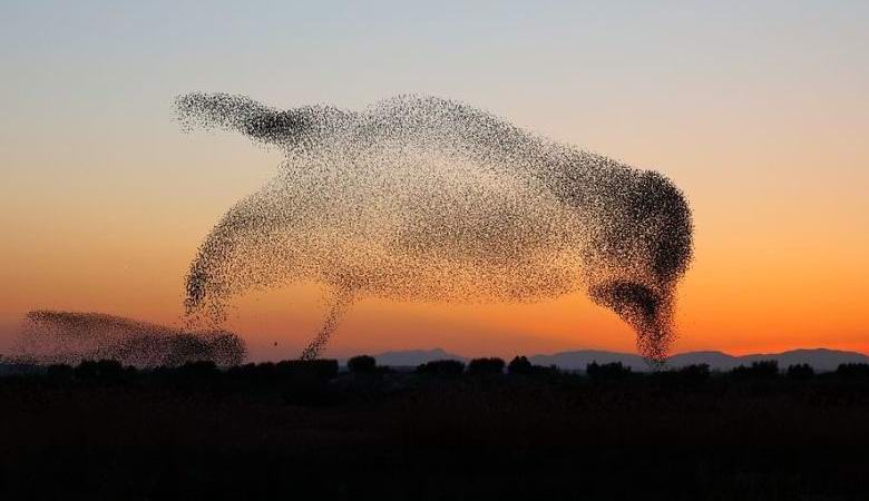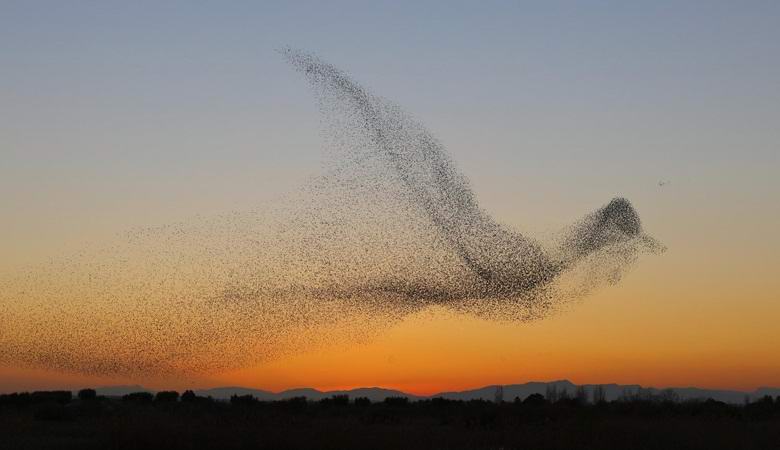 Ezúttal Spanyolország felett több ezer közönséges seregély repül, egy óriás madár sziluettbe hajtogatva. Oldalról még úgy tűnt hogy ez az óriási, ideiglenes madár az égen szárnyakkal csapkodik. A szerző A benyújtott fényképek azt sugallják, hogy a seregélyek nem éppen így. A német szerint a madarak hasonló módon reagáltak a sólyomállomány közelében. Azt mondják, hogy féljenek egy ragadozót, az énekesek képzeletbeli óriást alkottak a föld felett, amely sikeresen megtörtént megijedt az ellenségtől.
