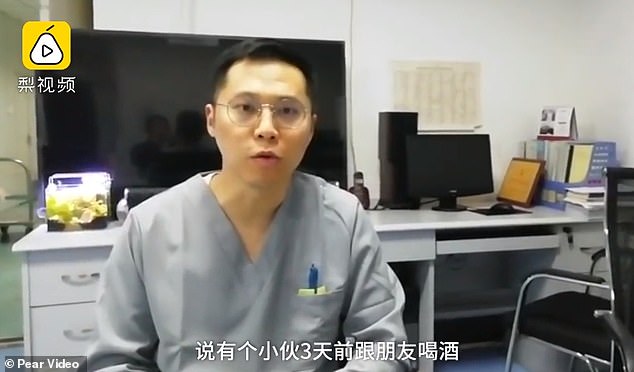 Két nappal később a kínai ismét ivott a barátaival, de amikor elérte a nyolcadik üveg sört hányt. A gyomor fájni kezdett és a férfi mindazonáltal úgy döntött, hogy orvosokhoz fordul. A belföldi ellenőrzés során egy orvosi intézményben, a beteg kinyitotta a száját, és az orvos erősnek érezte magát gáz szaga.